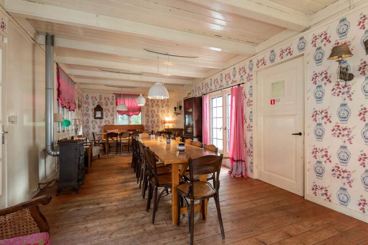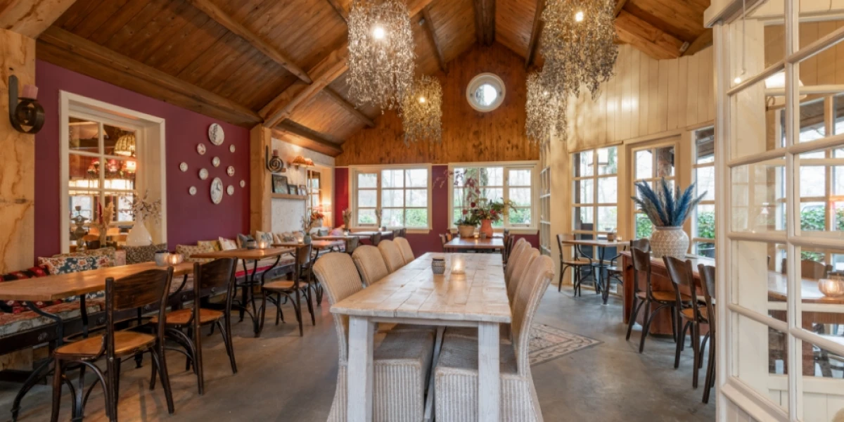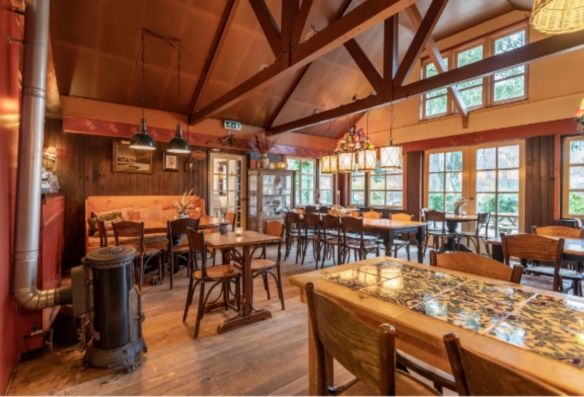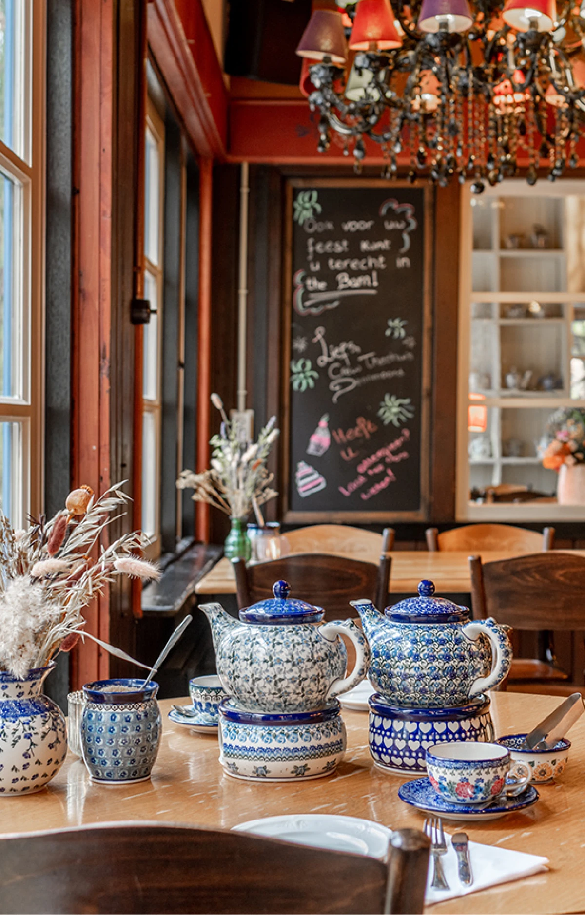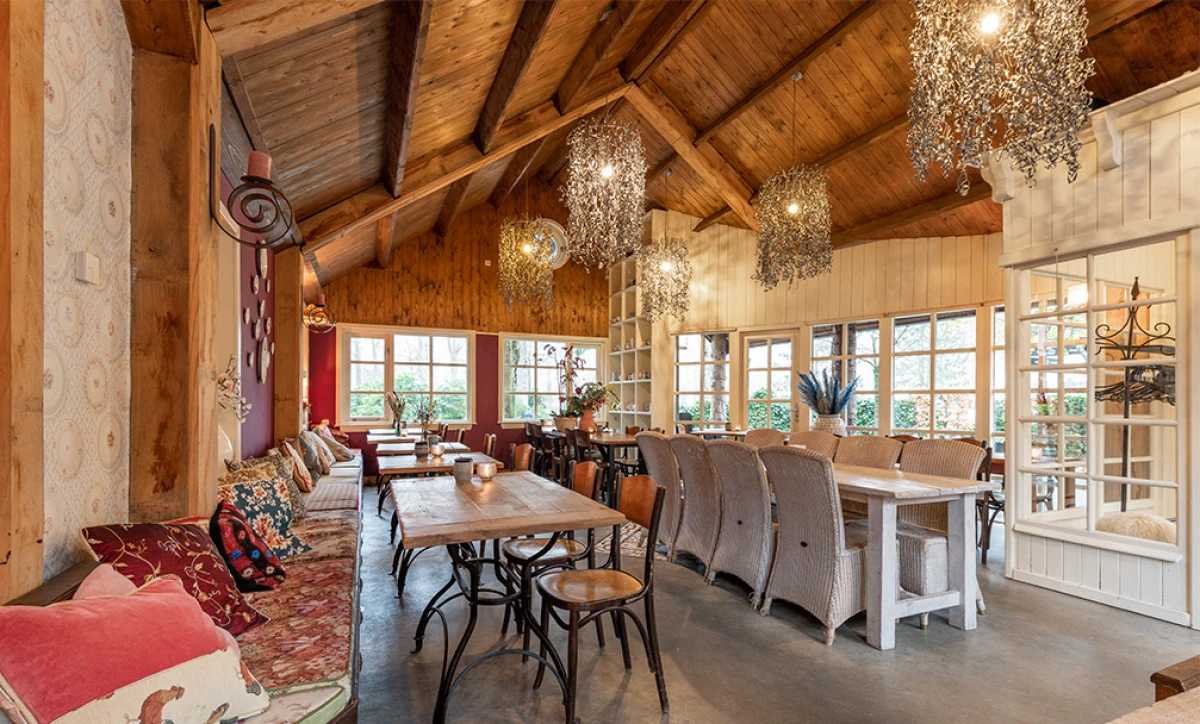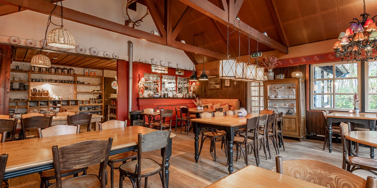 Het Theehuis is ons oudste gedeelte, waar het allemaal begon. Hier staat de bar waar één van onze meiden de meest heerlijke thee, maar ook een perfecte koffie klaar maakt! In de winter maanden kun je hier heerlijk genieten bij de warme kachel en in de zomer slaan de deuren van deze ruimte open naar het terras.