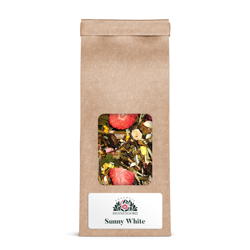 Melange van witte en groene thee, met ananas, limoengras, frambozenblad, kers, zonnebloembloesem, lemon myrtle, rabarber en peer. Heerlijke frisse smaak met passende vruchten
